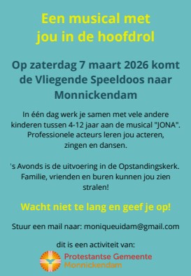 Op zaterdag 7 maart komt de Vliegende Speeldoos voor de derde keer naar Monnickendam. In 2024 voerden zij samen met een grote groep kinderen voor het eerst de musical Jona bij ons op. Vorig jaar speelden zij met de kinderen de musical Jozef. En vanwege het grote succes wordt Jona dit jaar opnieuw opgevoerd.